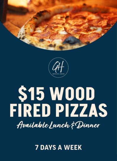 Pub eats at its finest. The heartbeat of our offering comes fresh to you from our epic woodfire pizza oven – with pizzas from just $14 every day!